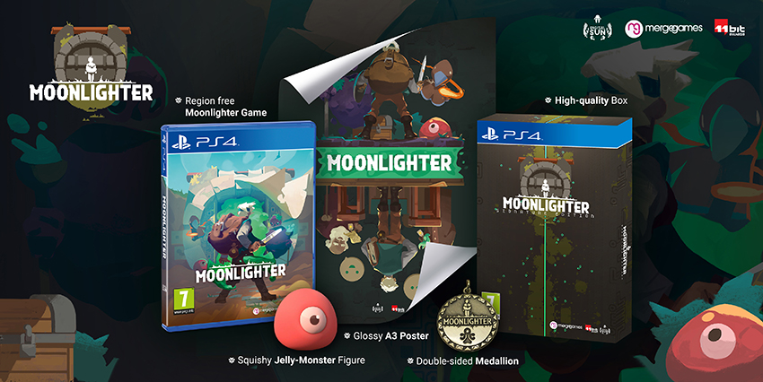 Heading towards Xbox One, PC and PlayStation 4, Moonlighter will be available in digital stores — Windows Store, Xbox Store, PlayStation Store, Steam, GOG and other major platforms — as well as in retail with both standard edition and limited Signature Edition. Containing a double-sided Medallion from the game, the Signature Edition also includes a glossy artwork poster and a squishy Jelly-Monster that you can repeatedly squeeze all while thinking about how to economically outsmart other merchants in the village of Rynoka.