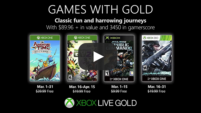 Welcome to another Games with Gold reveal for Xbox One and Xbox 360! In March on Xbox One, take to the sea and save the world with Finn and Jake in Adventure Time: Pirates of the Enchiridion, then it’s an all-out vegetable and undead battle extravaganza in Plants vs. Zombies Garden Warfare 2. On Xbox 360, and Xbox One via Backward Compatibility, command the elite Delta Squad against the vile Separatists in the classic Star Wars: Republic Commando, and then prepare to wield Raiden’s devastating katana blade in Platinum Games acclaimed action game Metal Gear Rising: Revengeance. All games will be available exclusively for Xbox Live Gold members for a limited time as part of Games with Gold. With Xbox Live Gold, you get the most advanced multiplayer service, free games, and exclusive member discounts on games in the Microsoft Store — get Xbox Live Gold today to get in on the action! • Adventure Time: Pirates of the Enchiridion ($39.99): Available March 1 to 31 on Xbox One • Plants vs. Zombies Garden Warfare 2 ($19.99): Available March 16 to April 15 on Xbox One • Star Wars Republic Commando ($9.99): Available March 1 to 15 on Xbox One and Xbox 360 • Metal Gear Rising: Revengeance ($19.99): Available March 16 to 31 on Xbox One and Xbox 360 Adventure Time: Pirates of the Enchiridion Take to the high seas in Adventure Time: Pirates of the Enchiridion. Help our heroes Finn, Jake, Marceline, and BMO discover why the Land of Ooo is underwater. Explore by land and sea, fight pirates, and search for hidden clues to solve the mystery and save their drenched world! Plants vs. Zombies Garden Warfare 2 Prepare for all-out battle in Plants vs. Zombies Garden Warfare 2. Dr. Zomboss has strengthened his zombie army, but the plants are on the offensive to reclaim their turf! Choose either side in 24-player multiplayer, 4-player co-op modes or go at it solo. The battle for suburbia begins now! Star Wars Republic Commando Chaos has erupted across the galaxy and it is your duty to combat it in Star Wars Republic Commando. Set during the events of the Clone Wars, as leader of an elite squad you’ll need to infiltrate, dominate, and annihilate your enemy. Your unit will follow your every command and act as a team to destroy the Separatist forces. You are the leader; they are your weapon. Metal Gear Rising: Revengeance The renowned Metal Gear franchise goes an exciting direction in Metal Gear Rising: Revengeance. Focusing on pure-action and epic storytelling, play as cyber-ninja Raidan, a child soldier transformed into half-man, half-machine. Slice and dice your cyborg enemies and take on a worldwide conspiracy with a high-frequency katana blade and a soul fueled by revenge. Read more about our Games with Gold program here and stay tuned to Xbox Wire for all the latest news on Xbox. Also, check out more than 100 great games in Xbox Game Pass included in its monthly membership that you can try free for 14 days. news.xbox.com |