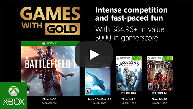 Welcome to another Games with Gold reveal for Xbox One and Xbox 360! In November on Xbox One, engage your enemies in the critically acclaimed shooter Battlefield 1, then test your nerves and dexterity in Race the Sun. On Xbox 360 and Xbox One via Backward Compatibility, relive the game that started it all in Assassin’s Creed, and rescue the soul of your beloved in Dante’s Inferno. All games will be available exclusively for Xbox Live Gold members for a limited time as part of Games with Gold. With Xbox Live Gold, you get the most advanced multiplayer service, free games, and exclusive member discounts on games in the Microsoft Store — get Xbox Live Gold today to get in on the action! • Battlefield 1 ($39.99): Available November 1 to 30 on Xbox One • Race the Sun ($9.99): Available November 16 to December 15 on Xbox One • Assassin’s Creed ($19.99): Available November 1 to 15 on Xbox One and Xbox 360 • Dante’s Inferno ($14.99): Available November 16 to 30 on Xbox One and Xbox 360 Battlefield 1 The highly acclaimed first-person shooter, Battlefield 1, is coming to Games with Gold! Fight to survive in the adventure-filled single-player campaign or join up to 64 players in epic multiplayer battle. Destructive environments, dynamic weather conditions, and vehicle-based combat in land, sea, and air are yours to experience as you dominate the battlefield. Race the Sun Test your coordination and reflexes in Race the Sun. Inspired by arcade games of the past, short games sessions are mixed with nerve-wracking tension and pure fun as you hurtle your solar-powered craft at breakneck speeds in a race against time. The rules are simple: Don’t crash, stay in the light, and don’t slow down! Assassin’s Creed Plug yourself back into the Animus in the game that started the franchise in Assassin’s Creed. Relive the adventures of your assassin ancestor, Altaïr, at the start of the centuries-long battle between the Assassins and the Templars over the mysterious artifact, the Apple of Eden. Dante’s Inferno Begin your epic quest of vengeance and redemption in Dante’s Inferno. Based on the classic poem, rescue the soul of your beloved Beatrice from the Nine Circles of Hell in this fast-paced action title. To succeed, you’ll need to confront fierce monsters, hideous demons, and your own personal sins. Read more about our Games with Gold program here and stay tuned to Xbox Wire for all the latest news on Xbox. Also, check out more than 100 great games in Xbox Game Pass included in its monthly membership that you can try free for 14 days. news.xbox.com |