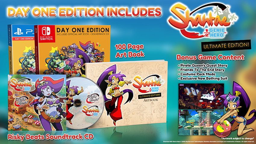 | Shantae: Half-Genie Hero – Ultimate Edition sets sail for Nintendo Switch and PlayStation 4 in Europe on 27 April PQube and WayForward are pleased to announce that PlayStation 4 and Nintendo Switch editions of Shantae: Half-Genie Hero – Ultimate Edition are sashaying into European retailers on 27 April 2018. Furthermore, all pre-order and launch copies will be the Day One Edition, which comes bundled with the 30-song Risky Beats soundtrack CD, and a 100-page artbook filled with unseen sketches of Shantae and the gang. Shantae: Half-Genie Hero – Ultimate Edition is the complete celebration of one of Shantae’s best-loved adventures. Bursting with digital bonus content, the Ultimate Edition contains the game itself, plus all former DLC extras including the Pirate Queen’s Quest story expansion, the Friends To The End story expansion, Hard Core Mode and the upcoming Costume Pack mode, which unleashes the Ninja Shantae, Beach Shantae and Officer Shantae challenge modes. Additionally, Shantae: Half-Genie Hero – Ultimate Edition also contains all former “Backer-Exclusive” content from the hugely successful 2013 Kickstarter campaign, enabling everybody access to the Tinkerbat Transformation and colour swaps. And, as a final treat for fans, the Ultimate Edition contains an exclusive blue swimsuit costume not available in any other edition.