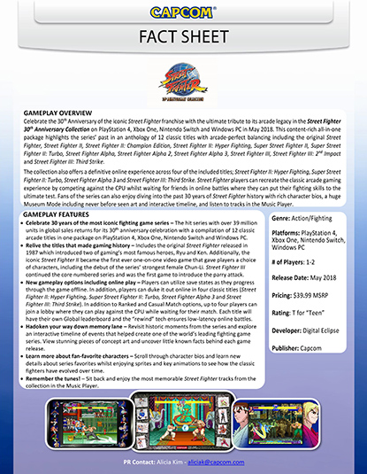 | Celebrate the 30th Anniversary of Street Fighter with the Street Fighter 30th Anniversary Collection! To celebrate the 30th anniversary of one of the world’s most popular video game series of all time, Capcom has announced the ultimate tribute to the Street Fighter arcade legacy in the Street Fighter 30th Anniversary Collection for PlayStation 4, Xbox One, Nintendo Switch and Windows PC coming in May 2018. The collection highlights the series’ past in this anthology of 12 iconic titles with arcade-perfect balancing, including the original Street Fighter, Street Fighter II, Street Fighter II: Champion Edition, Street Fighter II: Hyper Fighting, Super Street Fighter II, Super Street Fighter II: Turbo, Street Fighter Alpha, Street Fighter Alpha 2, Street Fighter Alpha 3, Street Fighter III, Street Fighter III: 2nd Impact and Street Fighter III: Third Strike. Players will be able to take the fight online in four of the classic titles for even more gameplay options, including Street Fighter II: Hyper Fighting, Super Street Fighter II: Turbo, Street Fighter Alpha 3 and Street Fighter III: Third Strike. Players can recreate the classic arcade gaming experience by competing against the CPU while waiting for friends in online battles where they can put their fighting skills to the ultimate test. Lobbies support up to four players waiting to climb up the ranks through Ranked Matches. Each title will also have their own Global leaderboards and the “rewind” tech ensures low-latency online battles. With the Street Fighter 30th Anniversary Collection, fans can re-visit historic moments from the series, including the introduction of two of gaming’s most famous heroes – Ryu and Ken in the original Street Fighter, and explore the timeline of events that helped create one of the world’s leading fighting game series. Fans can take a walk down memory lane in the Museum and view stunning pieces of concept art, scroll through character bios and uncover little known facts behind each game release with an interactive timeline. Audiophiles can also sit back and relax while listening to the most memorable Street Fighter tunes in the Music Player. Street Fighter 30th Anniversary Collection will have a simultaneous release in May 2018 on PlayStation 4, Xbox One, Nintendo Switch and Windows PC both digitally and at retail (console versions only). |