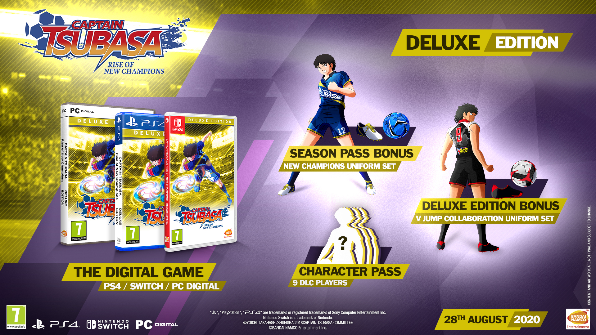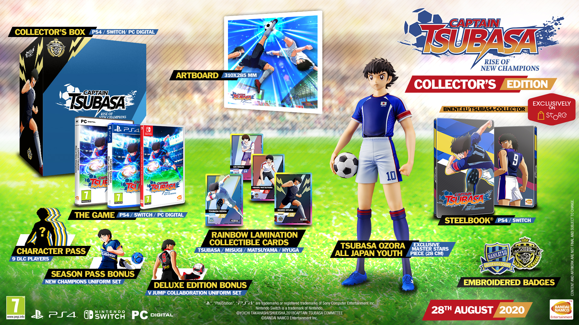| Captain Tsubasa: Rise of New Champions to launch on 28th August 2020 for PlayStation 4, Nintendo Switch and PC Digital! This new arcade football game will allow players to play as their favorite characters from the iconic franchise starting 28th August 2020. From breathtaking saves to gravity-defying shots, fans will be able to experiment the full range of moves that made the manga and anime a global success. Captain Tsubasa: Rise of New Champions will be available in Standard, Deluxe, Collector’s, Champions and Legends Editions along with an early purchase offer – available to preorder from May 26th and until the 28th September on digital stores and with participating retailers only. Check out the latest trailer revealing the first footage of four iconic national teams – France, Uruguay, England, Netherlands and Italy! The Champions Edition will be exclusive to our E-commerce store, adding to the already packed Collector’s Edition a customised jersey. The Legend Edition is something a bit more special, including a premium Tsubasa table football table, made by one of the most respected table football table makers in the word - René Pierre*, on top of the Champions Edition and exclusive to the BNEE E-commerce Store. *René Pierre is a famous French billiard and table football table manufacturer drawing his inspiration from furniture designers as well as pop-culture. All their products combine quality and design. A very limited amount of Legends Editions will be available, each carefully crafted and numbered making for a very unique item. |